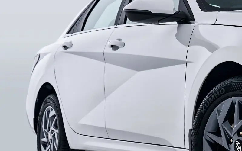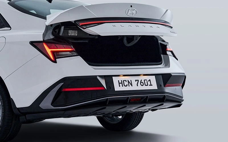 The front of the Hyundai ELANTRA commands attention with its bold, confident stance. The wide, cascading grille merges seamlessly with sharp, angular headlights, creating a striking face that exudes power and sophistication. The stereoscopic parametric jewel-pattern design highlights the depth of the front grille, making it resemble diamond-cut gemstones, and the bold and elongated front headlights come together to give the car its front sporty look. This design isn't just about aesthetics—it's engineered for aerodynamics, making the ELANTRA as efficient as it is stunning.